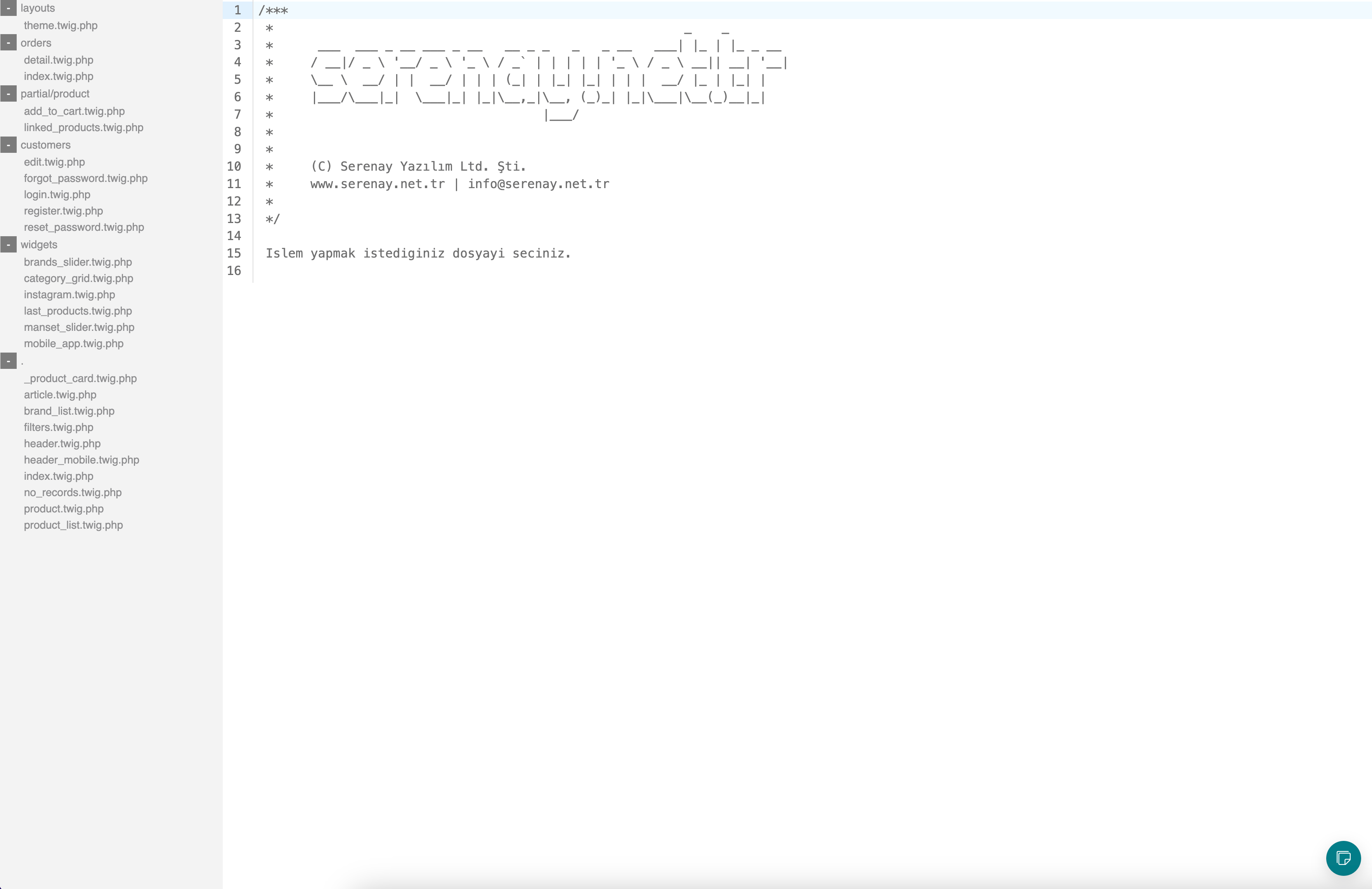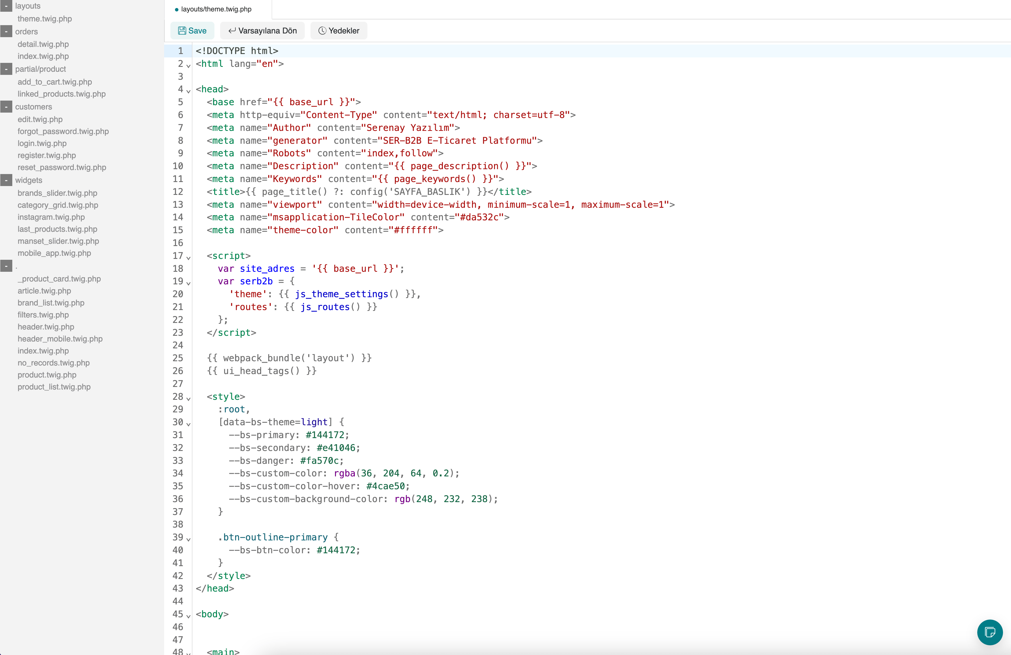 serB2B Tema Editörü, geliştiricilere serB2B platformunda tasarımın her yönünü özelleştirme imkanı sunan güçlü bir araçtır. Bu özellik sayesinde, platformun görsel ve fonksiyonel bileşenlerini Twig ve PHP kodlama kullanarak değiştirebilirsiniz. Tema Editörü ile özelleştirilen tasarımlar, şirketinizin ihtiyaçlarına daha uygun hale getirilebilir, kullanıcı deneyimi geliştirilebilir ve marka kimliği güçlendirilebilir.