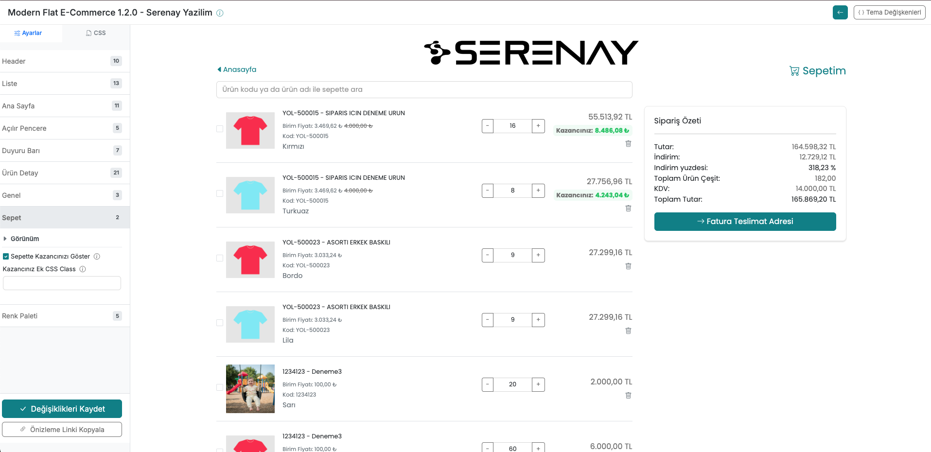 Tema Ayarları modülü, serB2B sisteminin görünümünü ve kullanıcı deneyimini iyileştirecek temel yapı taşlarını yönetmenizi sağlar. serB2B yönetici paneli menüsünden Tasarım > Tema Ayarları bölümüne giderek dokuz farklı sekme (Header, Liste, Ana Sayfa, Popup, Duyuru Barı, Ürün Detay, Genel, Sepet, Renk Paleti) altındaki tüm seçenekleri yapılandırabilirsiniz.
