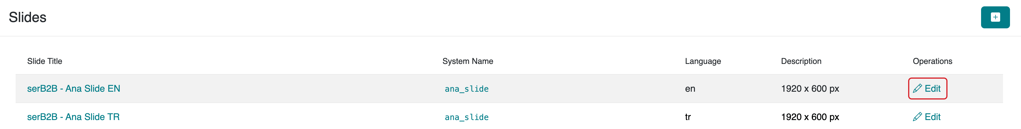 Navigate to the Design > Slides section in the admin panel of your serB2B system to view the slides defined in your system.