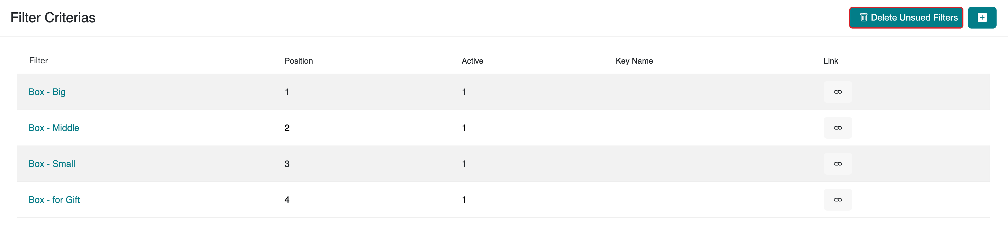 If there are no products matching certain filter criteria, you can delete these criteria all at once. Go to the Products > Product Filter Criteria section in the admin panel, view the filter groups, and click Delete Unused in the top right corner of the relevant group's Criteria section.