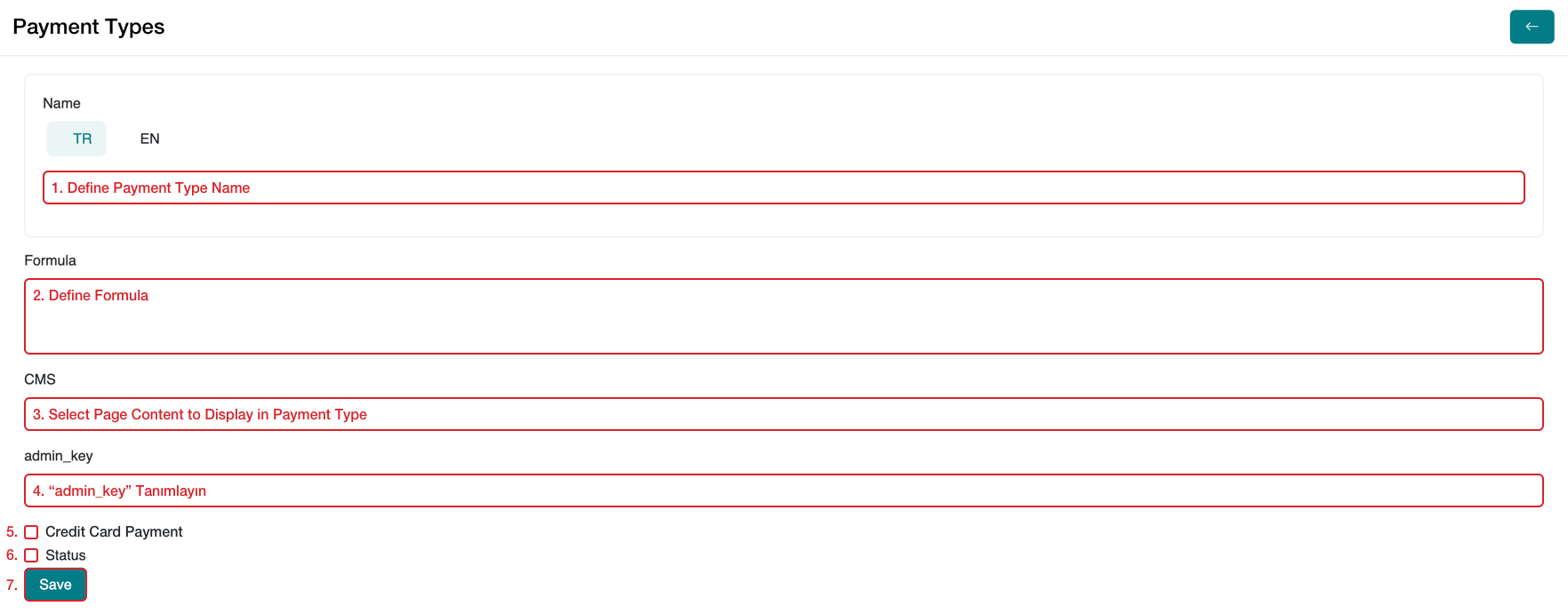 Go to Settings > Payment Types from the admin panel of your serB2B system, then click the + button in the top-right corner and follow the steps below.
