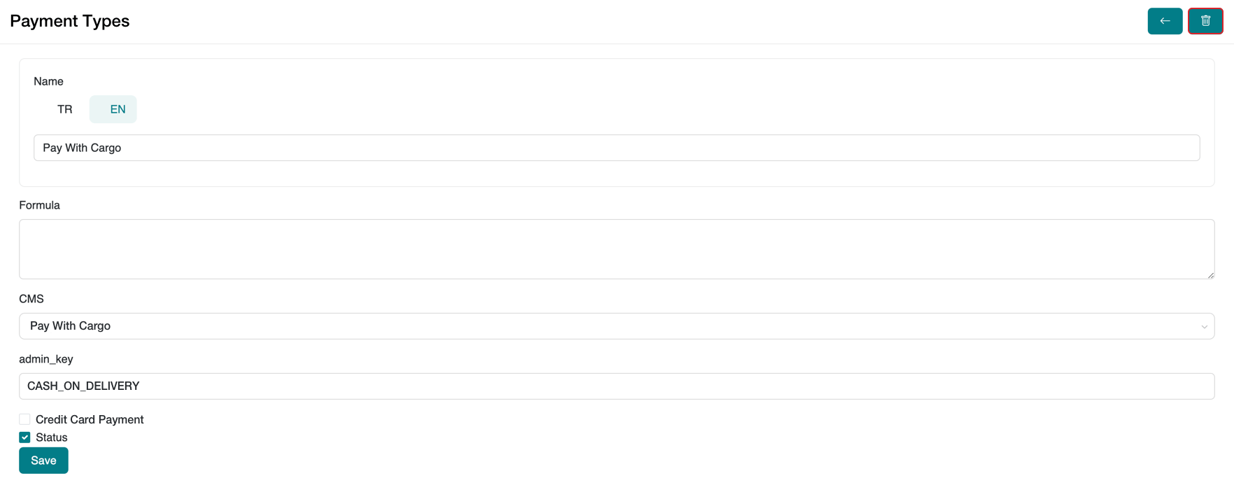 - In the Status field, check the box to activate the payment type. To deactivate it, leave the box unchecked.