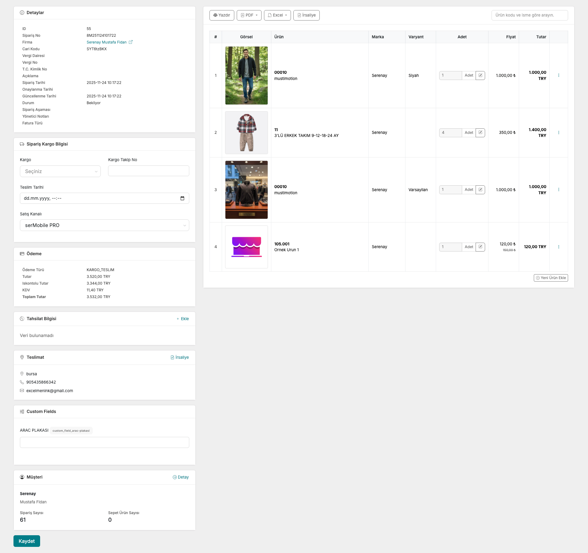 Sipariş detay sayfasına girerek teslimat adresi, ödeme bilgileri veya özel notlar gibi alanlarda güncellemeler yapabilir ve Kaydet butonuna basarak değişiklikleri kaydedebilirsiniz.