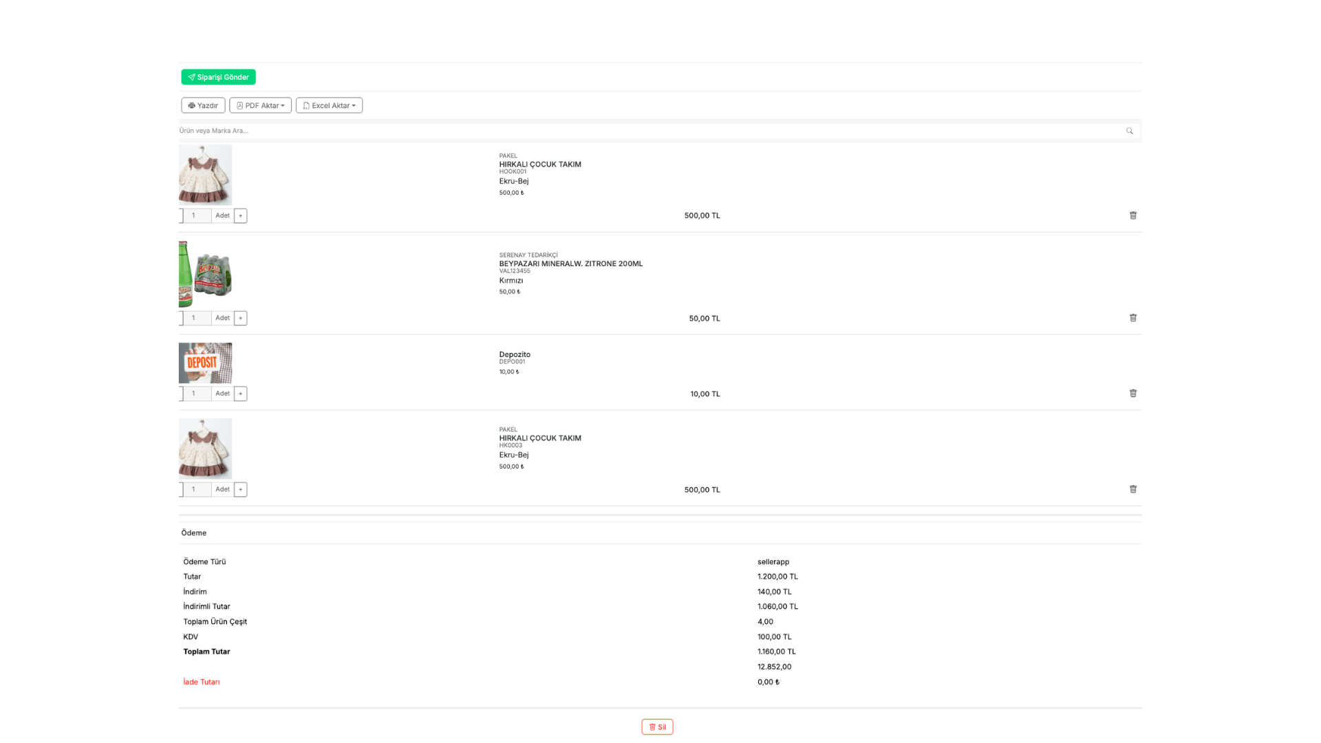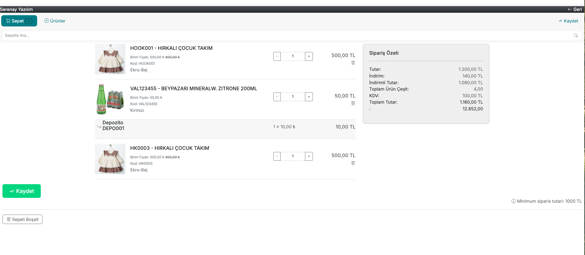 - Ürünler listelenir, miktar girilerek sepete eklenir.