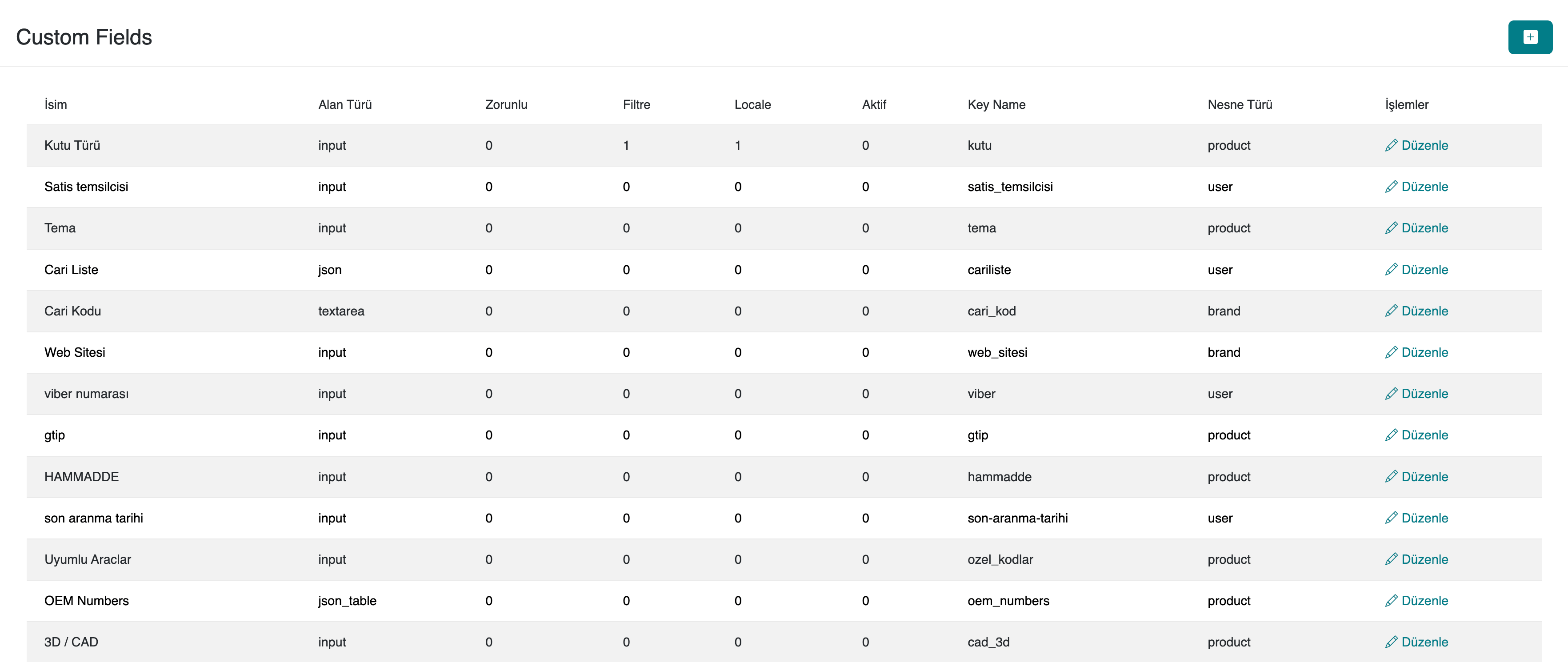 serB2B sisteminizde mevcut olan veya yeni oluşturduğunuz custom fields - özel alanları görüntülemek ve düzenlemek için yönetici panelinden Ayarlar > Custom Fields (Özel Alanlar) bölümüne gidin. Ardından, düzenlemek istediğiniz custom field - özel alan satırındaki Düzenle butonuna tıklayarak güncellemelerinizi yapın.