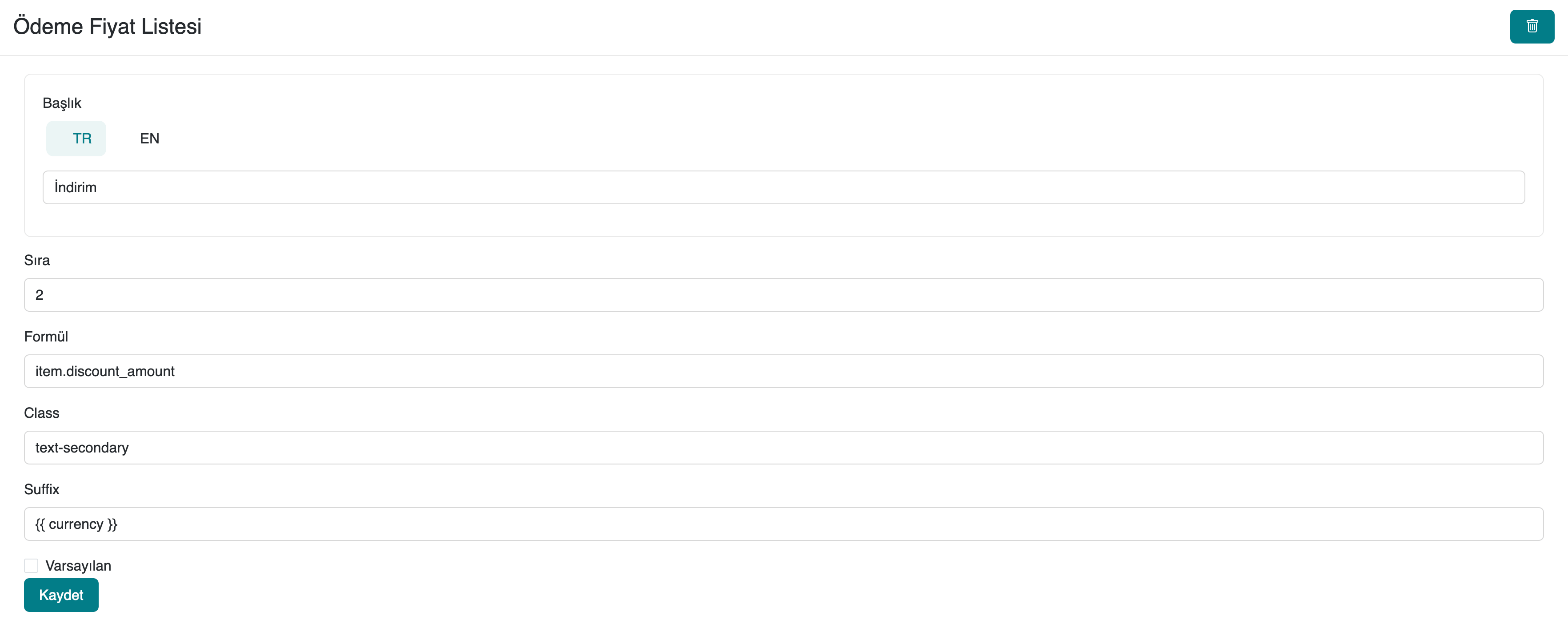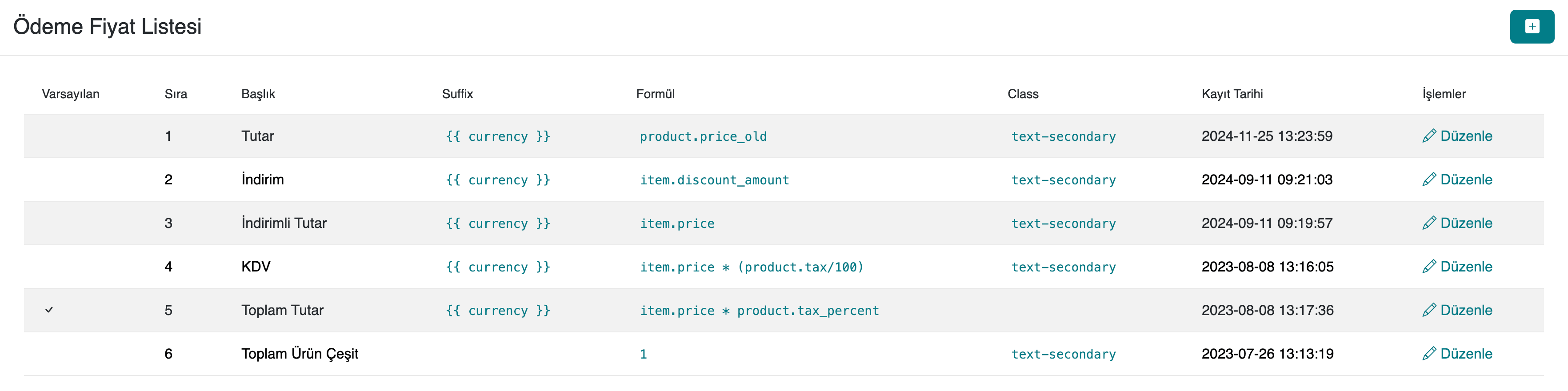 Yeni bir ödeme fiyat listesi oluşturmak için Ayarlar > Ödeme Tutar Ayarları bölümünde sağ üst köşede bulunan + ikonuna tıklayın. Sonrasında başlık, sıra numarası, formül, stil sınıfı ve ek açıklama gibi alanları doldurarak listeyi kaydedebilirsiniz.