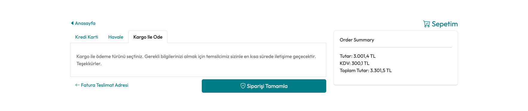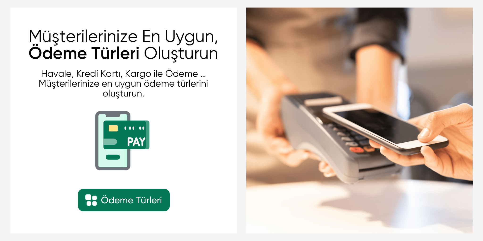 serB2B sisteminde müşterilerinize Kredi Kartı ile Ödeme, Havale ile Ödeme, Kargo ile Ödeme gibi çeşitli ödeme seçenekleri ekleyebilirsiniz. Bu sayede, müşterilerinizin ihtiyaçlarına ve tercihlerine en uygun ödeme yöntemlerini sunarak alışveriş deneyimlerini kolaylaştırabilirsiniz. Farklı ödeme türleri, müşteri memnuniyetini artırırken aynı zamanda dönüşüm oranlarını yükseltmenize yardımcı olur. Bu seçenekler sayesinde, müşterileriniz güvenli, hızlı ve esnek ödeme süreçlerinden faydalanabilir.