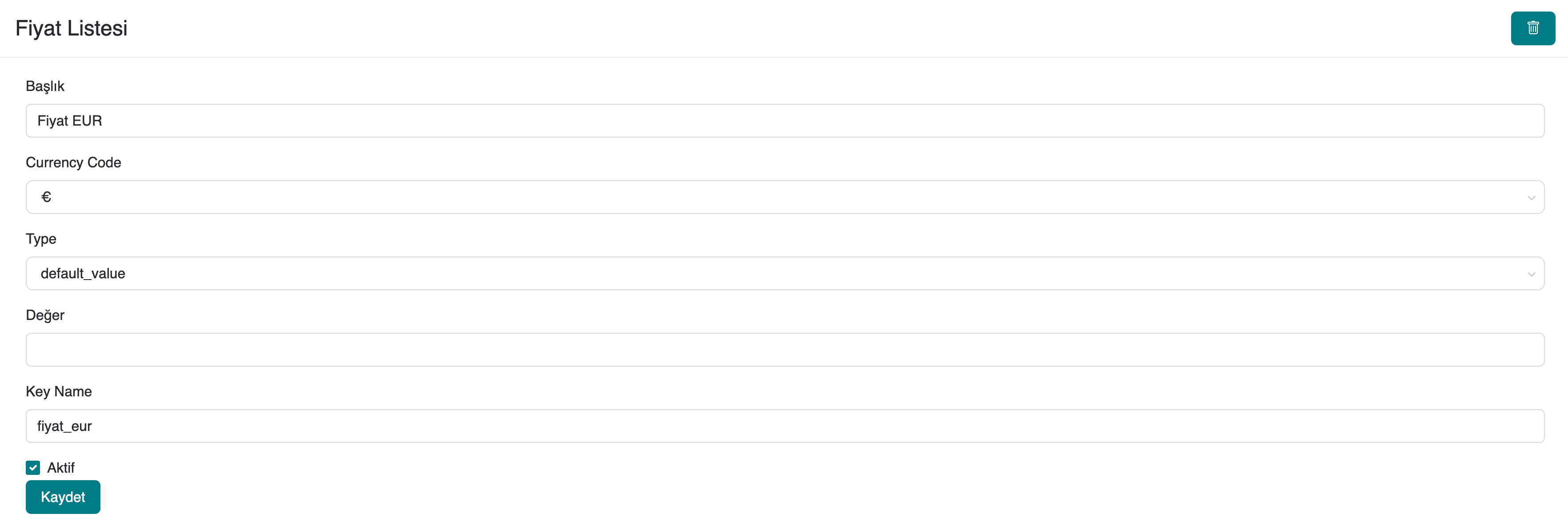 - Aktif: Fiyatın geçerli olması için kutucuğu işaretleyin.