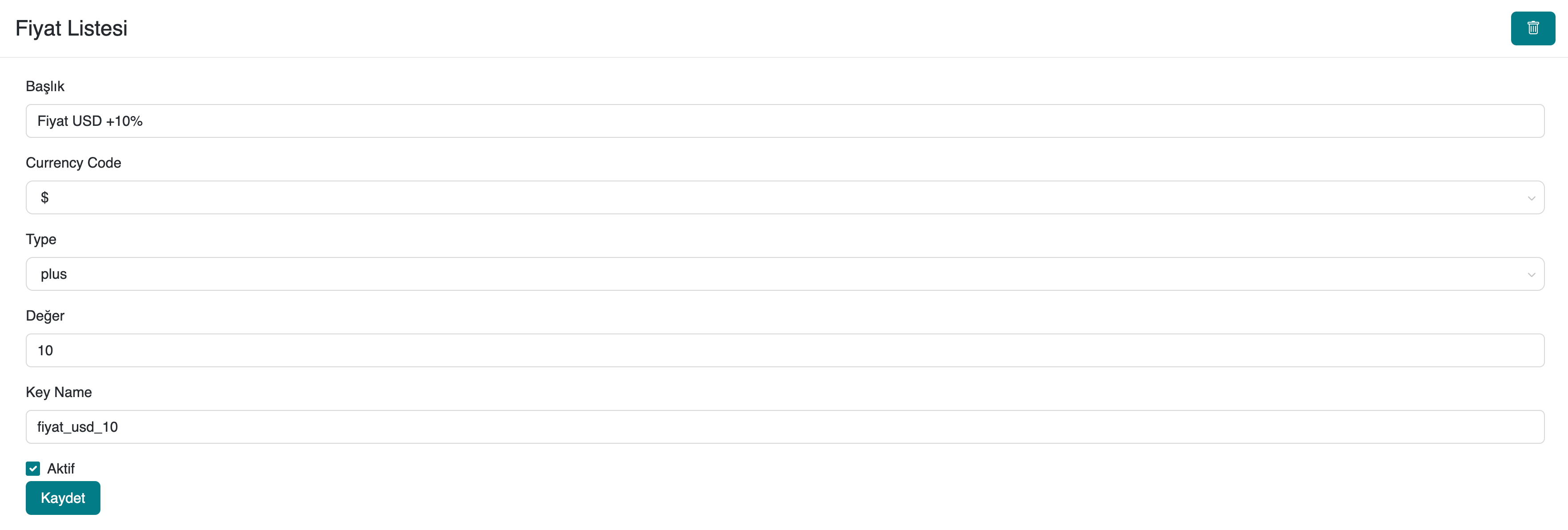 - Aktif: Fiyat listesinin geçerli olması için kutucuğu işaretleyin.
