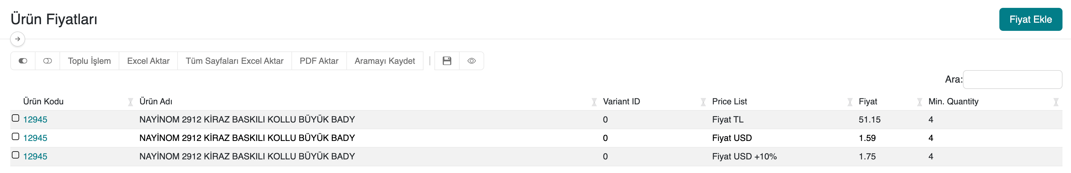 ii. Oluşturduğumuz fiyat listelerini görüntüleyelim.