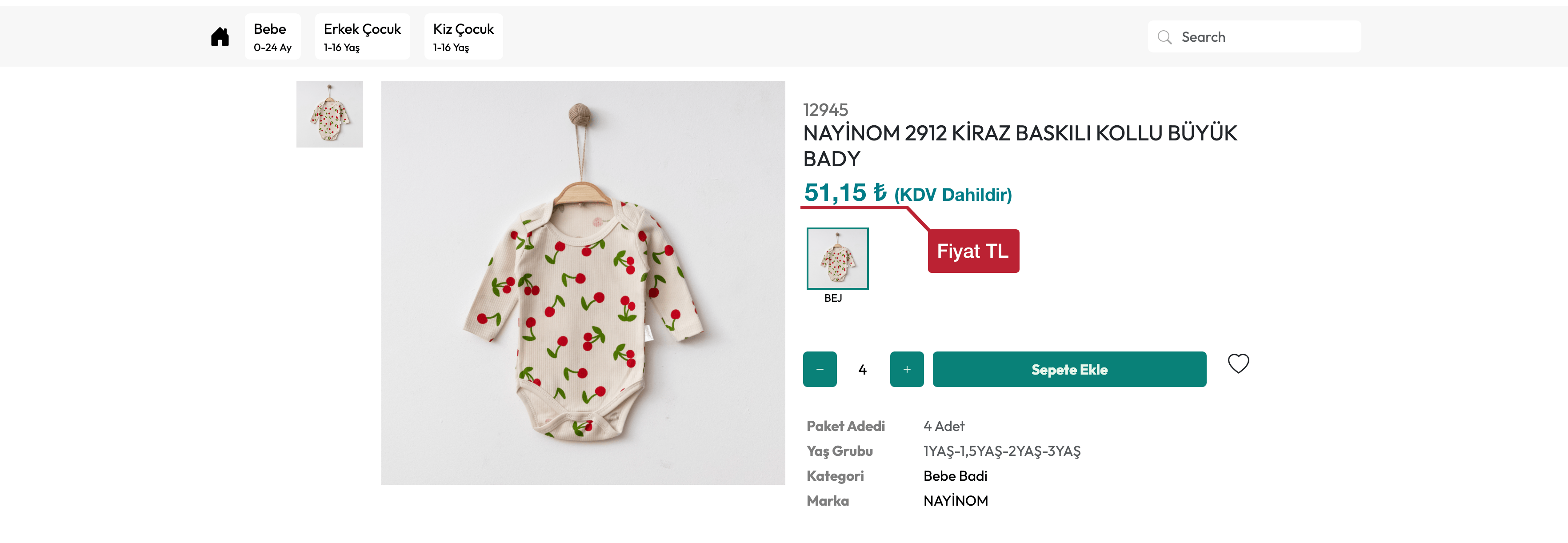 iii. Ürün için oluşturulan Fiyat TL değerini sitemizde görüntüleyelim.