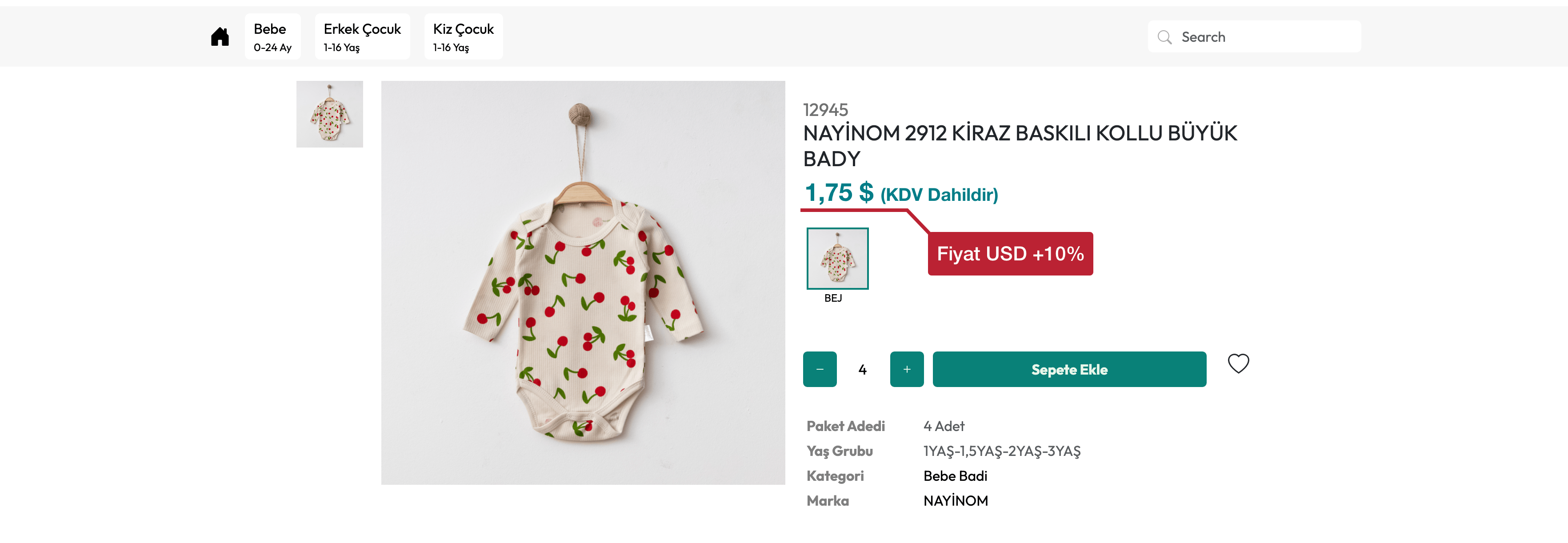 iv. Ürün için oluşturulan Fiyat USD +10% değerini sitemizde görüntüleyelim.