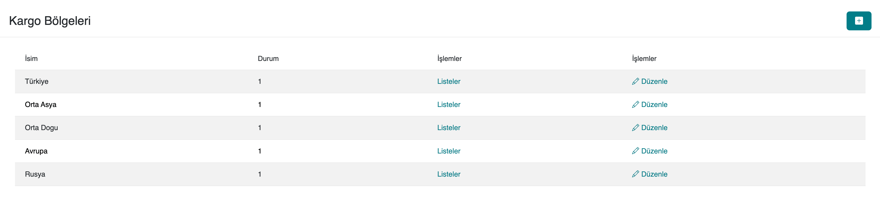 serB2B sisteminizde mevcut olan veya yeni oluşturduğunuz kargo bölgesi listelerini görüntülemek ve düzenlemek için yönetici panelinden Ayarlar > Kargo Bölgeleri bölümüne gidin. Ardından, düzenlemek istediğiniz kargo bölgesi satırındaki Düzenle butonuna tıklayarak güncellemelerinizi yapın.
