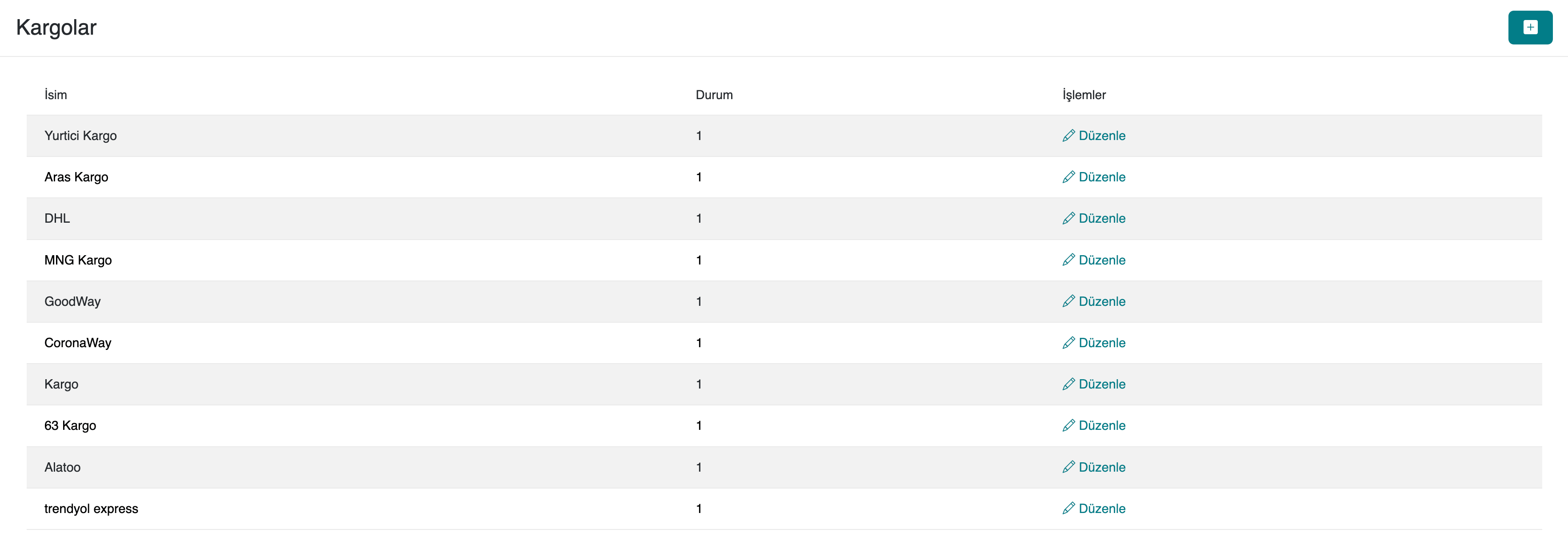 serB2B yönetici panelinizin Ayarlar menüsünden Kargolar bölümüne gidin ve tanımlı kargoları listeleyin.
