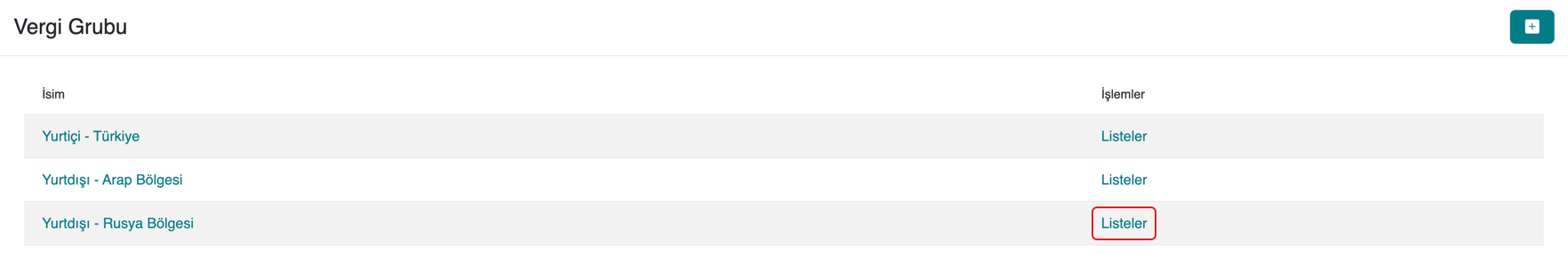 Adım Adım Kılavuz - I deki yönergeleri takip ederek "Yurtdışı - Rusya Bölgesi" tanımlı vergi grubunu oluşturalım. Sonrasında oluşturduğumuz Vergi Grubu'nun Listeler bölümüne tıklayarak işleme devam edelim.