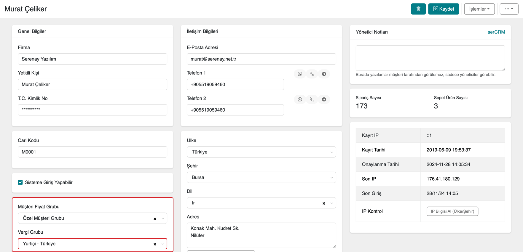 Vergi grubu değiştikten sonra müşteri detay sayfası şu şekilde güncellenir: