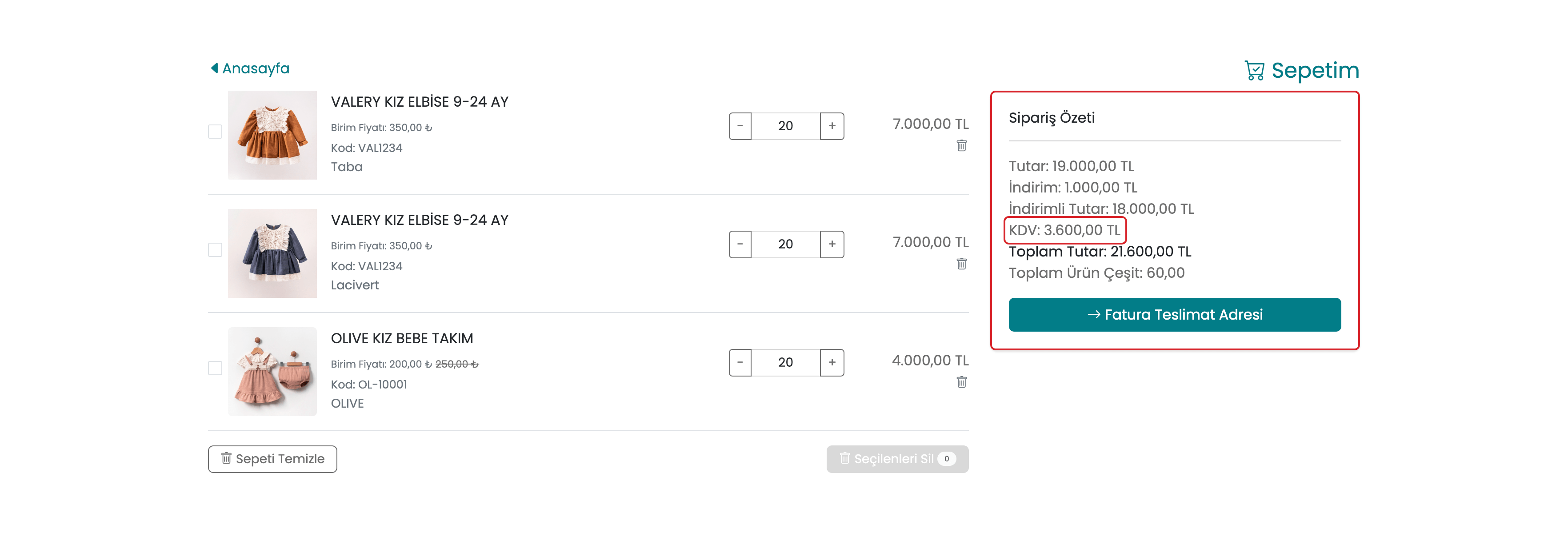 Müşteri sepetteki ürünlerin vergi oranlarını bu şekilde görür.