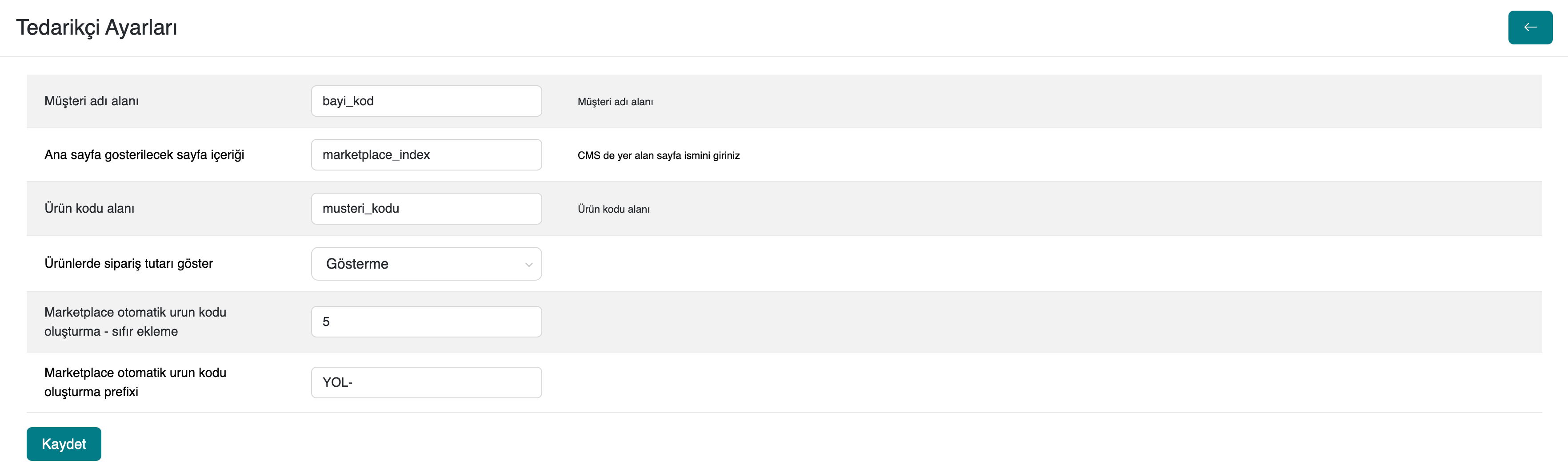 Tedarikçi ayarları sayfası, Marketplace modülünün doğru çalışabilmesi için gerekli olan müşteri, ürün ve siparişle ilgili alan eşleştirmelerinin tanımlandığı yerdir. Bu ayarlar, sistemin tedarikçiden gelen verileri nasıl okuyacağı ve göstereceğini belirler.